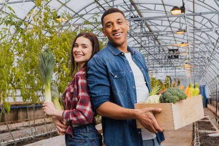 Cheerful interracial farmers holding vegetables and looking at camera in greenhouse