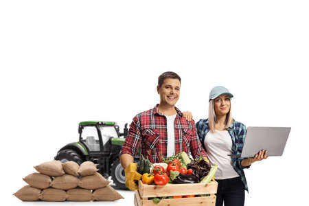 Young farmers with a crate of vegetables and a laptop computer standing in front of a tractor isolated on white background