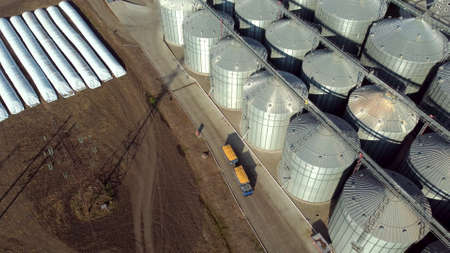 Truck filled with yellow grain drives near new metal modern elevator sunny day