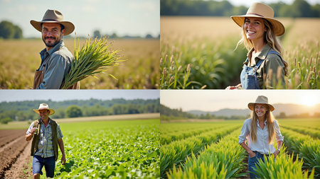 Expansive agricultural fields showcase neat rows of vibrant green crops and golden wheat under a vast sky with...
