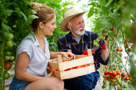 Happy family working in organic greenhouse. Senior man and child growing bio plants in farm garden.