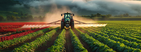 Tractor spraying crops with pesticides at sunrise in a colorful agricultural field.