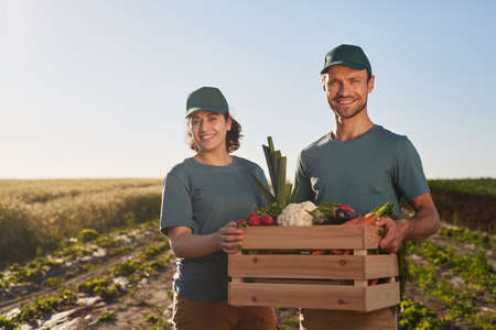 Waist up portrait of two workers holding box of vegetables and smiling at camera while standing ant plantation outdoors, copy space