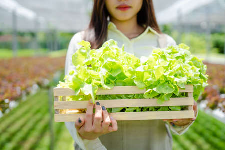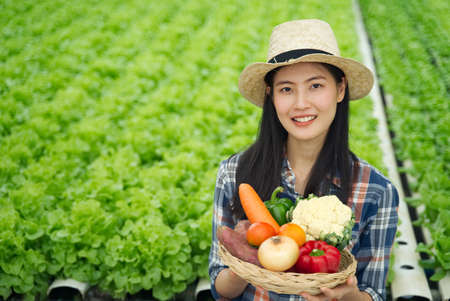 Asian woman farmer holding a basket of fresh lettuce on a farm in a greenhouse hydroponics farm system for customers, concept organic vegetable.