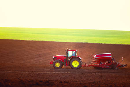 Tractor sowing seed on plowed field. Sowing seeds of corn and sunflower. Blue Tractor with disk harrow on plowing field. Seeding machinery on farm field. Seed sowing in farmland, aerial view.