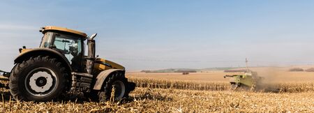panoramic shot of tractors on golden field against blue sky