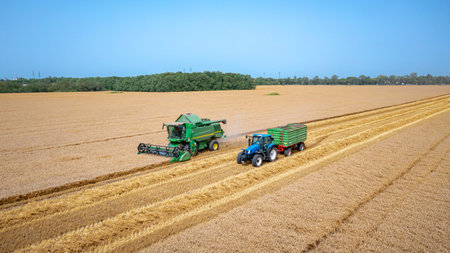 Above view over agricultural harvester, combine as cutting and harvesting mature wheat on farm fields. Tractor with two trailers is ready for transshipment