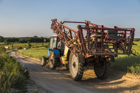 Tractor with high wheels is making fertilizer on young wheat. The use of finely dispersed spray chemicals. Tractor on the sunset background.