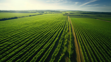 Experience the beauty of agriculture from above, showcasing neatly arranged rows of crops that thrive in rich, vibrant green farmland.