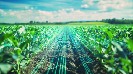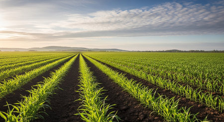 Straight rows of vibrant green corn seedlings stretch across a vast agricultural field under a dynamic sky with...
