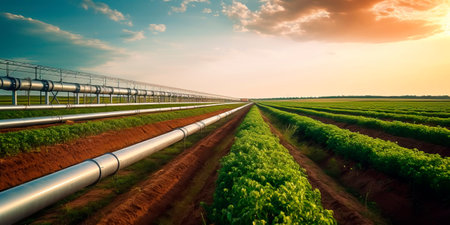expansive agricultural landscape with an industrial pipeline winding through fields of crops.