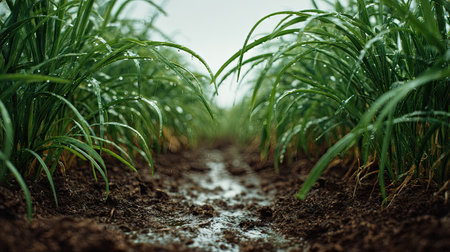 A panoramic wide view of Caraway field growing closely together after rain wet leaves reflecting soft light fresh soil visible ultra realistic photography cinematic wide composition lifelike natural scene