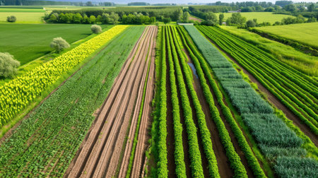 This aerial image captures the beauty of diverse green crop fields arranged in neat rows, showcasing the intricate patterns of rural agriculture.