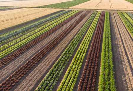 This aerial photograph showcases vibrant green rows of diverse crops, emphasizing the beauty of agricultural landscapes and the harmony of nature.