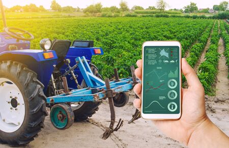 A hand is holding a smartphone with infographics on background of tractor and Bulgarian pepper plantation. Farming and agriculture. Agricultural machinery, data analyzing on plants status. harvesting