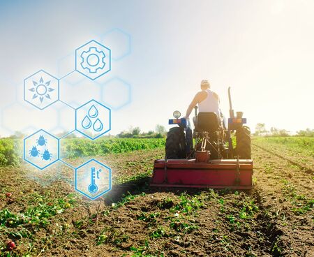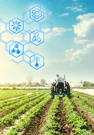 A farmer drives a tractor across potato plantation field and hexagons with innovations. Science of agronomy. Improvement in quality and yield growth. Reducing the impact on the environment.