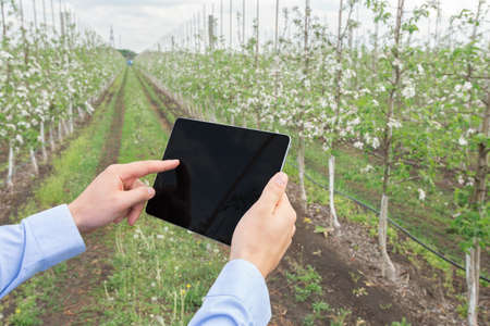 Closeup farmer collecting data of trees cultivation with technological tablet. Worker inspecting plants quality modern device on farmland countryside plantation. Agribusiness organic food concept