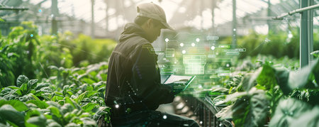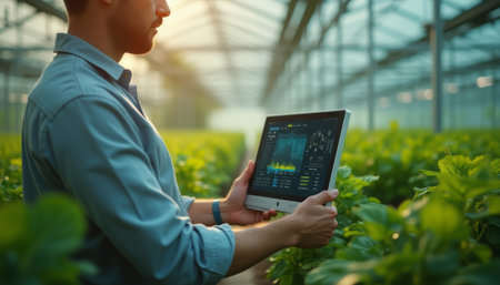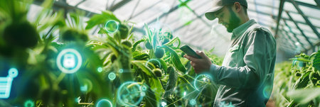 An agricultural expert uses a tablet to monitor plants in a modern greenhouse, showcasing the use of technology in sustainable farming. The scene is innovative and green.