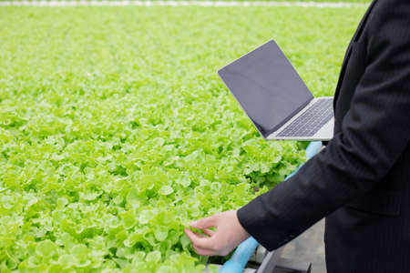 Businessman examine and record the quality reports of organic vegetables on the farm by tablet. Strictly checking vegetables on the farm. Farmers use tablet to check the quality of the vegetable.