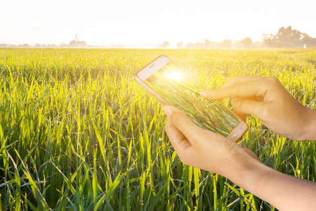 A smart phone in hand with a scenic view of a field in the hands,Smart farming Agricultural technology,Smart farmer Concept