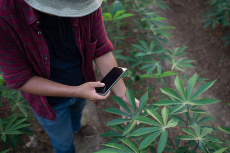 Innovation technology for smart farm system, Agriculture management, Hand holding smartphone with smart technology concept. asian male farmer working in Sugarcane farm To collect data to study.