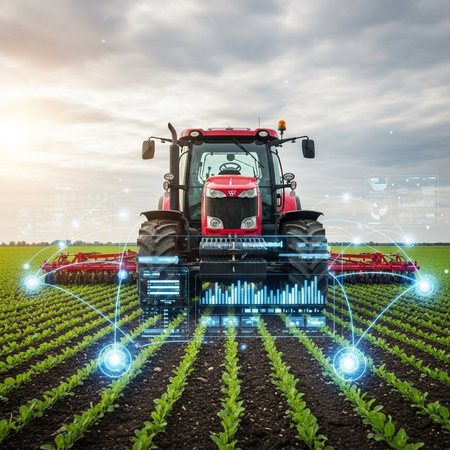 Smart farming technology enables efficient agriculture in fields at sunset. Generative AI