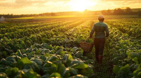 Farmer with a basket of chard on the field at sunset