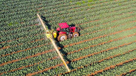 Tractor spraying pesticides on vegetable field with sprayer at summer