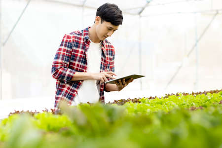 Smart farming and farm technology concept. Smart young asian farmer man using tablet to check quality and quantity of organic hydroponic vegetable garden at greenhouse in morning.
