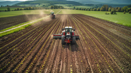 Farmer in tractor preparing land with seedbed cultivator in farmlands. Tractor plows a field. Agricultural work in processing, cultivation of land. Farmers preparing land and fertilizing. Agricultural workers with tractors.