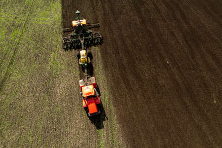 Above top view, of tractor as pulling mechanical seeder machine over arable field, soil, planting new cereal crop, corn, maize.
