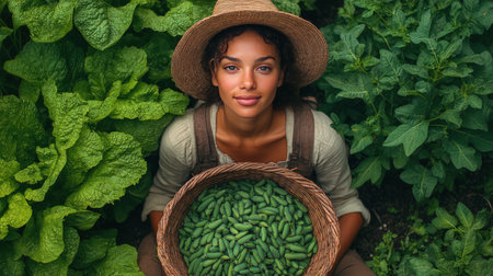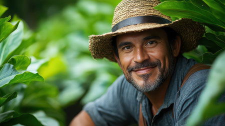 A farmer in a straw hat smiles joyfully while surrounded by vibrant green foliage showcasing a warm connection with nature and agriculture.