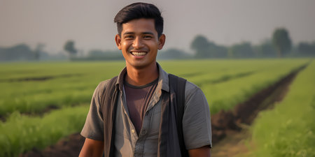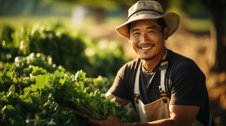 Portrait of young Asian farmer standing in the vegetable garden and looking at camera ai generated.“This image was created using generative artificial intelligence tools