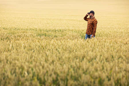 A farmer stands in the middle of a golden wheat field and inspects ears of wheat. Harvest concept