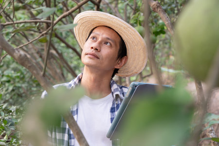 Organic farming, fruit farm. Farmers recheck quality record on application on tablet. Pomelo grow naturally, Ecological Biological, Healthy, Technology, non toxic, harvest