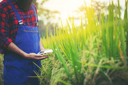 Asian man farmer with smartphone walk to inspect rice trees on the rice farm.