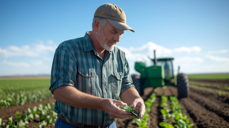 Farmer examining crops while a tractor works in the background on a sunny day in the countryside