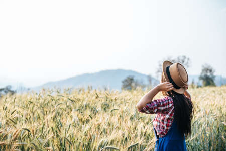 Young agronomist or farmer wearing a straw hat checks spikelets in the middle of a ripe wheat field