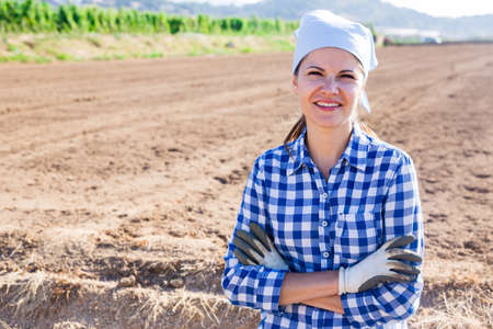 Portrait of female farmer in cultivated wheat seedling field, farm worker with plaid shirt and baseball cap