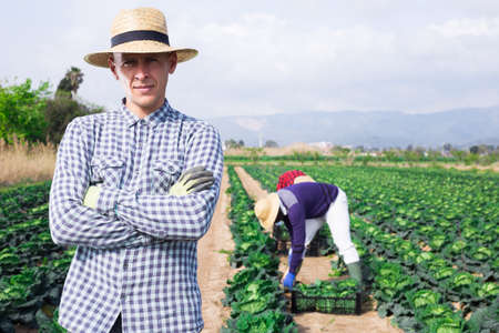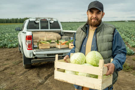 Happy young farmer with harvest of cabbage standing against field and car with other vegetables