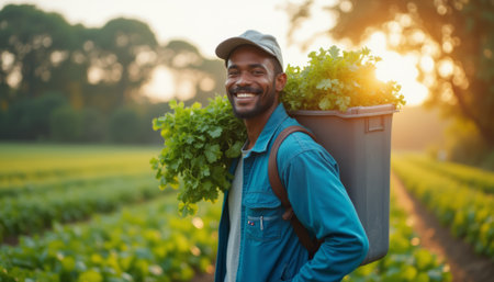 A cheerful Black man smiles brightly while carrying a container filled with fresh herbs on his back, set against a vibrant green field at sunset. The warm glow of the sun enhances the scene, highlighting the joy of hard work and the beauty of nature.