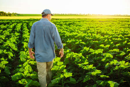 A man farm worker walks along the rows of young green sunflowers in the field on the sunset. Farmer looks sideways and checks the growth progress on the sunflowers. Agriculture and farming concept