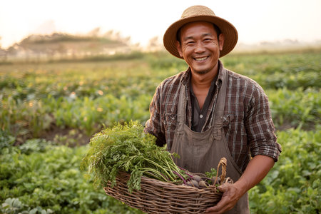Happy male farmer is carrying a basket filled with freshly picked carrots in a verdant field, highlighting the beauty of agriculture and outdoor labor