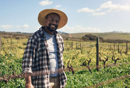 Portrait of confident farmer standing in field at sunny day in vineyard