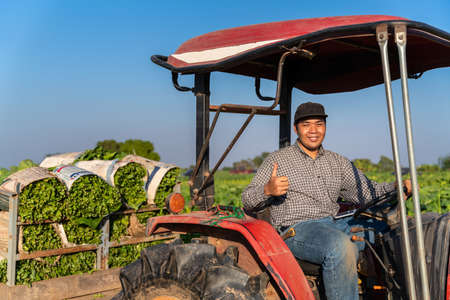Asian young farmer happily sits on a tractor with harvested tobacco leaves in a tobacco field. Agriculture.