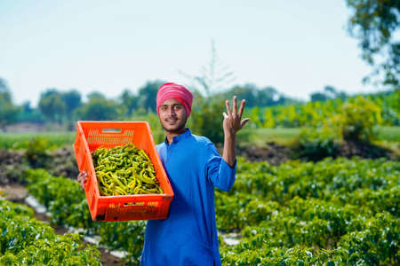 Young indian farmer collecting green chilly in plastic crates at green chilly field