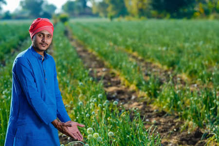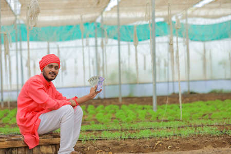 young indian farmer counting and showing money at greenhouse or polyhouse