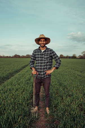 Farmer inspecting green barley crop development in field, adult male agronomist with straw hat and plaid shirt working on farmland
