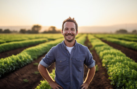 Farmer is standing in his growing soybean field. He is satisfied because of good progress of plants.