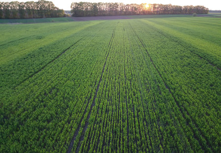 Aerial view of green agricultural fields in spring with fresh vegetation after seeding season on a warm sunny day